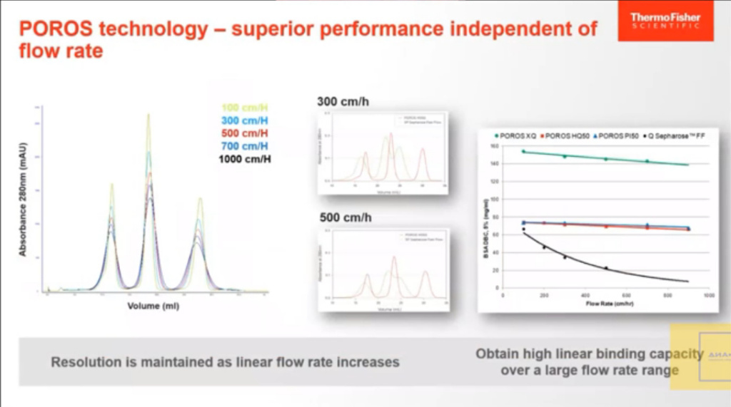На маленьких графиках приведено сравнение традиционного сорбента SP Sepharose Fast Flow и POROS 50 micron HS. Получается, что при скорости 300 см в час видны более четкие пики на POROS, менее четкие – на сефарозе. Но при увеличении скорости до 500 см в час второй пик на сефарозе полностью размывается, то есть невозможно разделить два разных продукта, потому что сорбент уже не работает на таких скоростях.