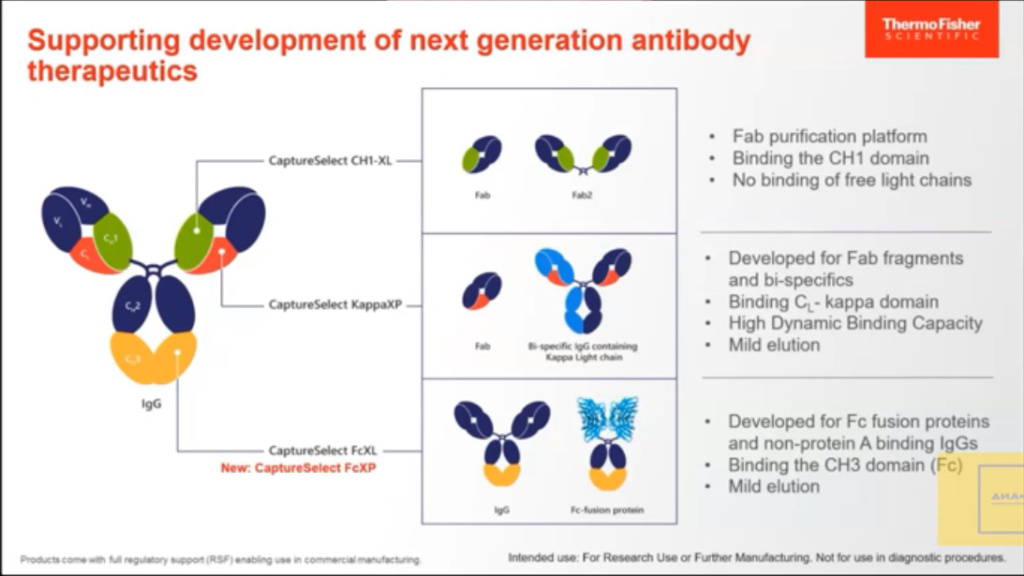 Так, CaptureSelect CH1-XL – это платформа для очистки CH1-XL –содержащих фрагментов Fab и Fab2, а также IgG антител, связывающая домен CH1 и не связывающая легкие цепи.