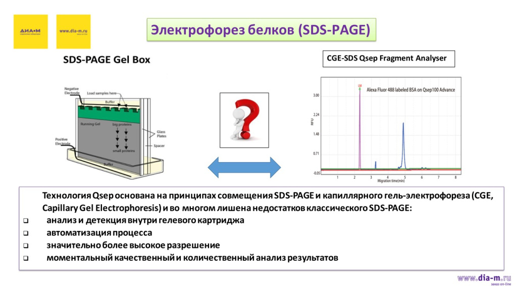 Еще одно из применений Qsep – электрофорез белков. На представленном приборе это получается лучше, чем обычный форез в полиакриламидных гелях: во-первых, здесь происходят и анализ, и детекция внутри картриджа, во-вторых – происходит автоматическая обработка результата, а результат виден на экране – результаты обработки свечения флуоресценции. Здесь более высокое разрешение, как заявляет производитель, чем это будет при форезе в обычной форезной камере.