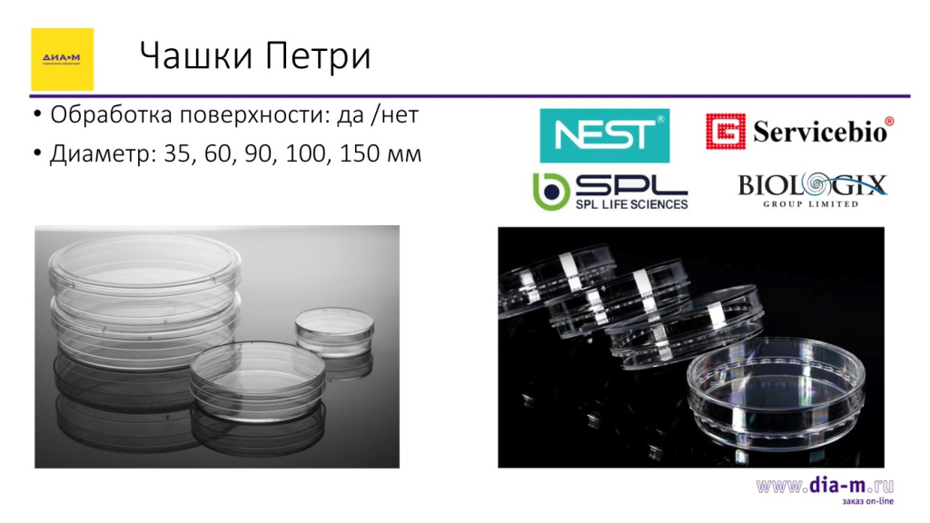 Чашки Петри тоже поставляют все четыре компании с разным объемом (доступны диаметры 35, 60, 90, 100 и 150 мм) и форматом обработки – они представлены в нашем портфолио.