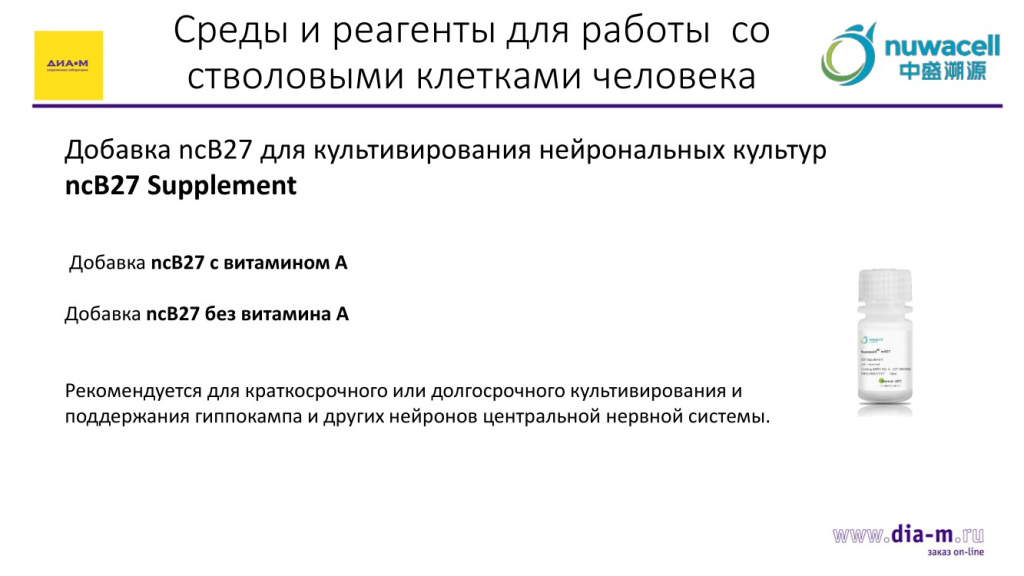 Отрадно также сообщить, что очень популярная в работе с клетками добавка ncB27 для культивирования нейрональных культур также производится в этой компании в двух вариантах – с витамином А и без витамина А (рекомендуется для краткосрочного или долгосрочного культивирования и поддержания гиппокампа и других нейронов центральной нервной системы).