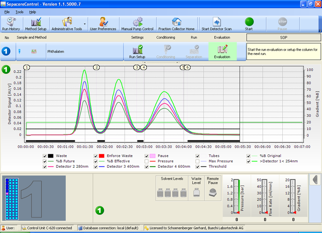 Блок управления C-620 с программным обеспечением SepacoreControl предназначен для установки на хроматографические системы Sepacore 10 и Sepacore 50. Это устройство позволяет автоматизировать проведение всех этапов флэш-хроматографии, в т. ч. заполнение колонок сорбентом; смешивание растворителей и приготовление их градиента; управление работой насосных блоков, коллекторов фракций и детекторов; построение хроматограмм по результатам проведенной детекции с возможностью распознавания элюируемых соединений в режиме реального времени. Кроме того его можно использовать для записи апробируемых хроматографических процедур, а также регистрации и хранения полученных результатов в электронной базе данных.