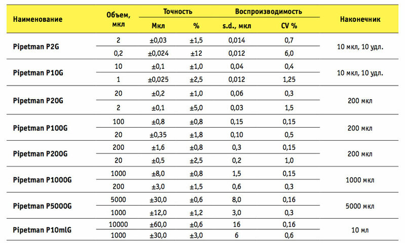 Автоматические пипетки серии Pipetman G, таблица