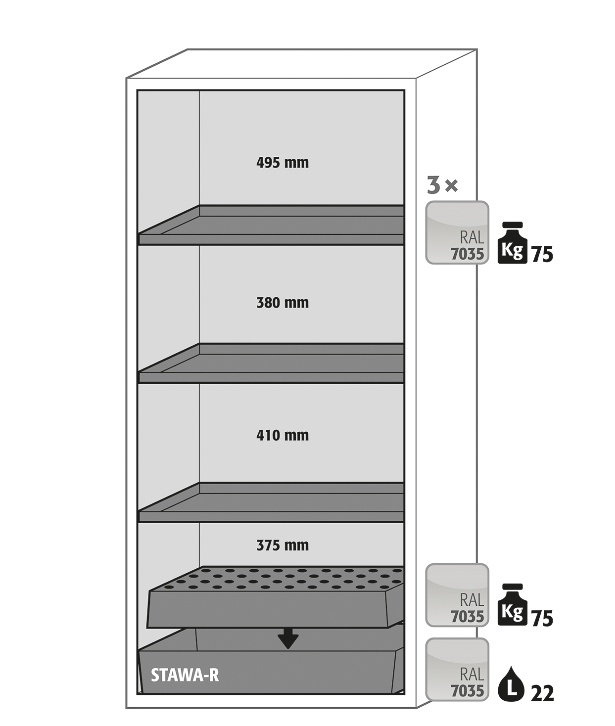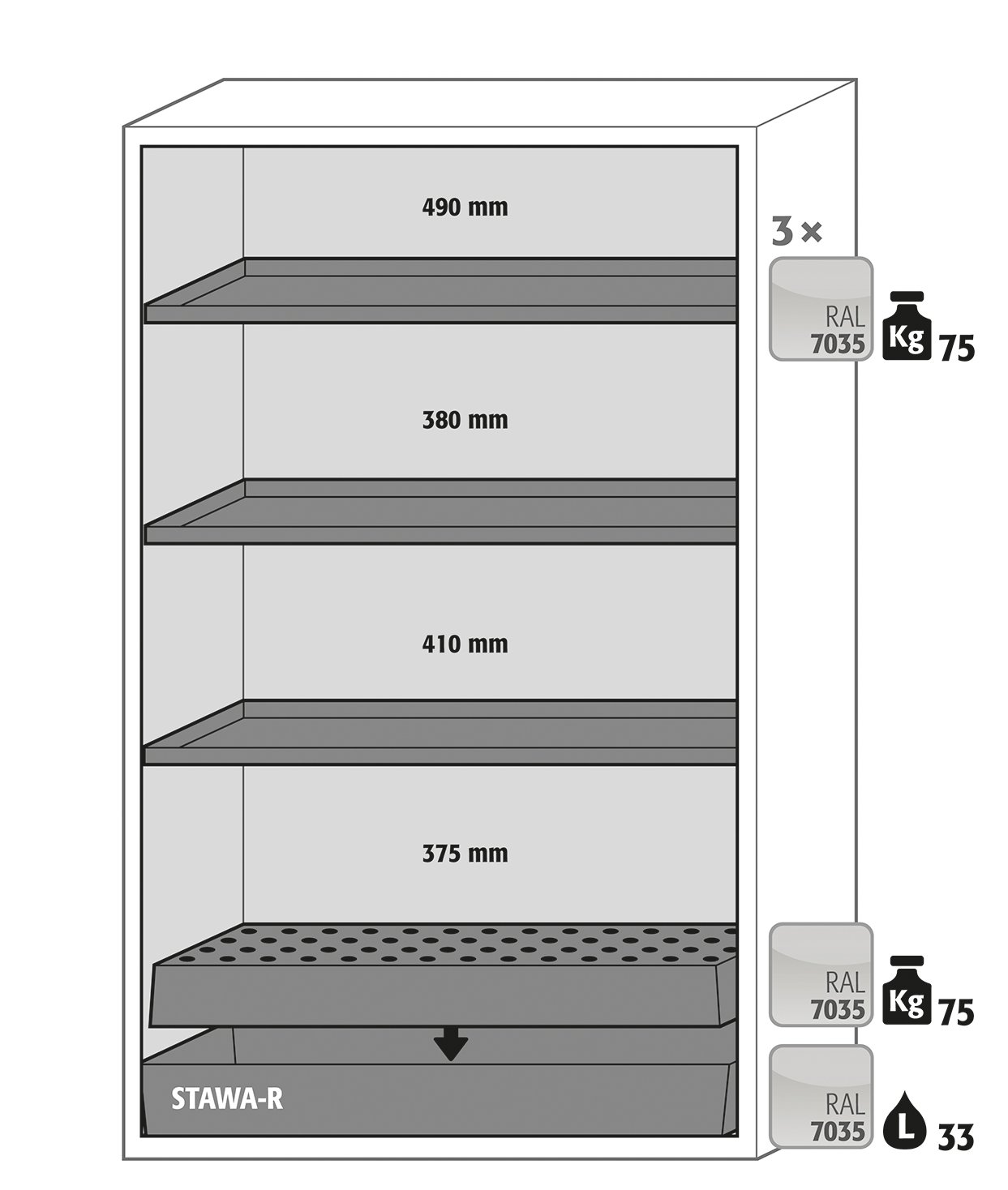 • 1 перфорированная вставка (грузоподъемность 75 кг, окрашенная н/ж сталь);