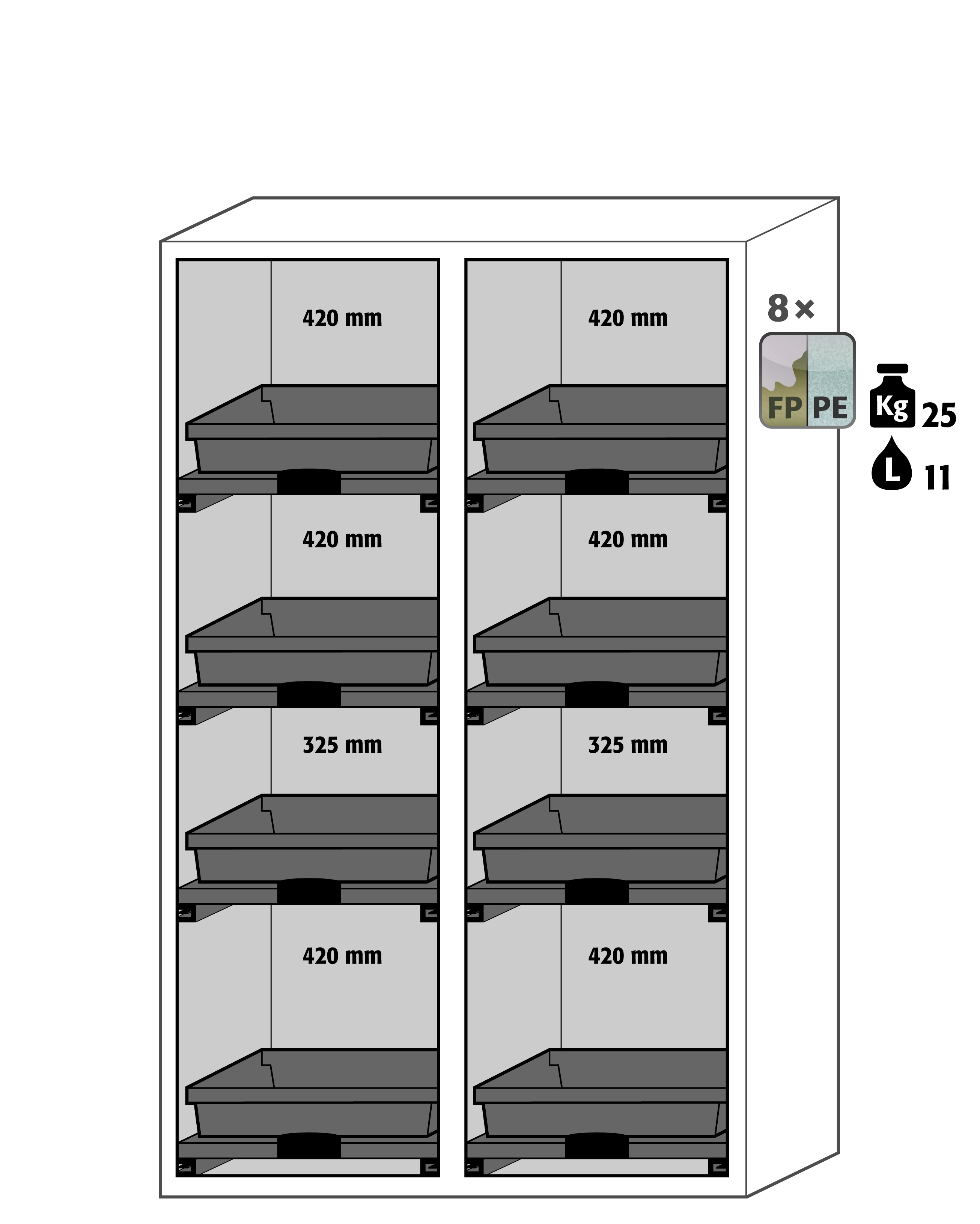 • два герметично разделенных отсека (вертикально или горизонтально) для хранения кислот и щелочей в одном шкафу;