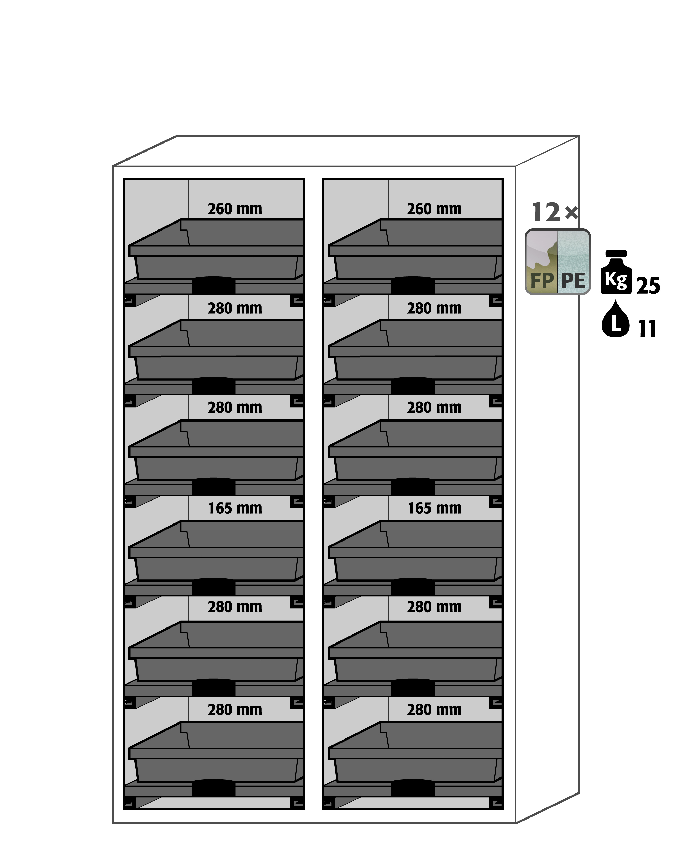 • 12 выдвижных полок с полипропиленовыми поддонами (грузоподъемность 25 кг, емкость 11 л);