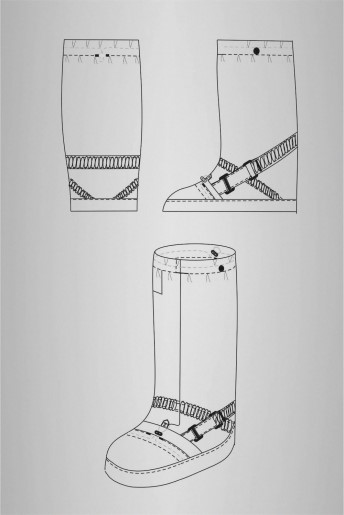 • фиксация бахил на ноге с помощью регулируемого запятника и фиксатора для пристёгивания к брюкам;