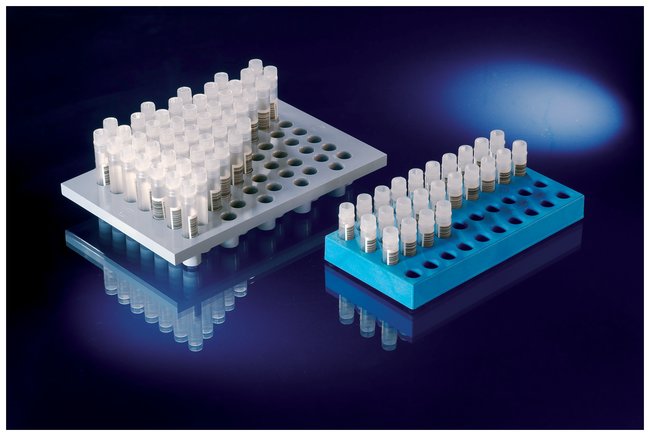 Настольный держатель криогенных пробирок от производителя Nunc, Thermo FS. Держатель позволяет открывать крышки пробирок одной рукой избегая контаминации.