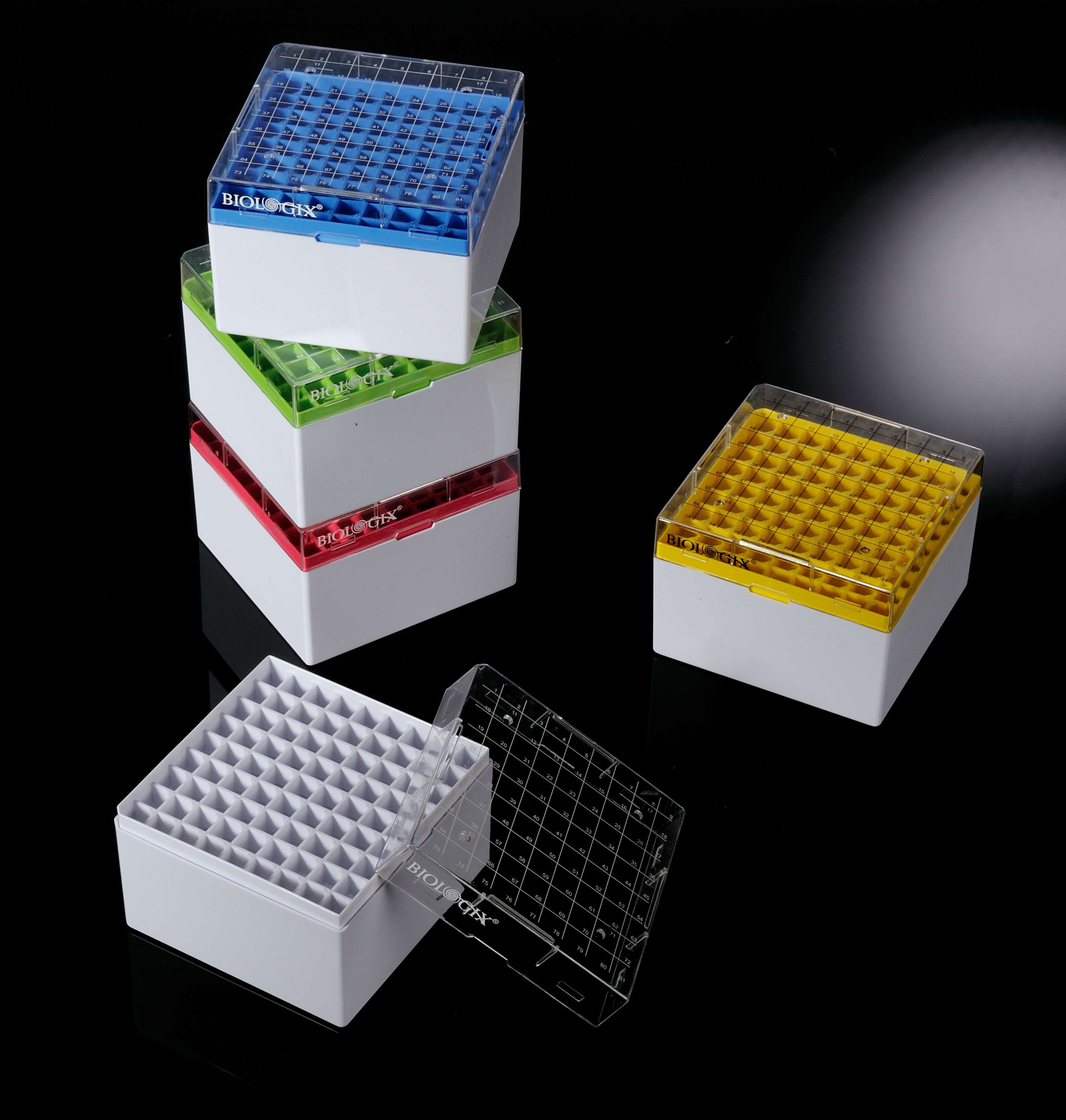 Штатив для хранения криопробирок 5 мл, 81 место, поликарбонат, с крышкой, набор разных цветов, Biologix, Китай