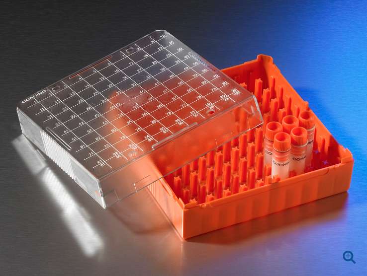 Штатив для хранения криопробирок 1-2 мл, 81 место, поликарбонат, с крышкой, оранжевый, 5 шт./уп., Corning
