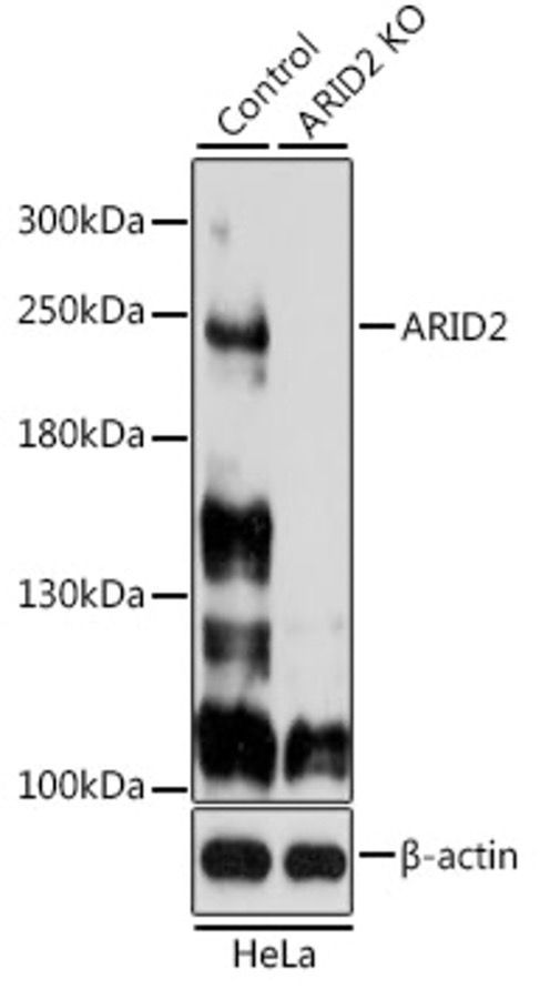 Вестерн-блот-анализ экстрактов нормальных (контрольных) и нокаутных по ARID2 (KO) клеток HeLa с использованием антитела ARID2 (A8601) в разведении 1:500.