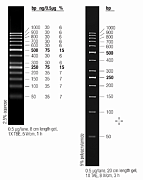Маркер молекулярного веса ДНК GeneRuler 100 bp Plus содержит 14 фрагментов от 100 до 3000 п.н.; фрагменты: 100, 200, 300, 400, 500, 600, 700, 800, 900, 1000, 1200, 1500, 2000, 3000 п.н.; имеет эталонные полосы (повышенной концентрации) при 500 и 1000 п.н., что облегчает идентификацию в геле; предварительно смешан с буфером для нанесения; рекомендуемый объём для нанесения на гель — 1 мкл; условия хранения: при комнатной температуре или при 4 °С до 6 месяцев, более длительное хранение при -20 °C.