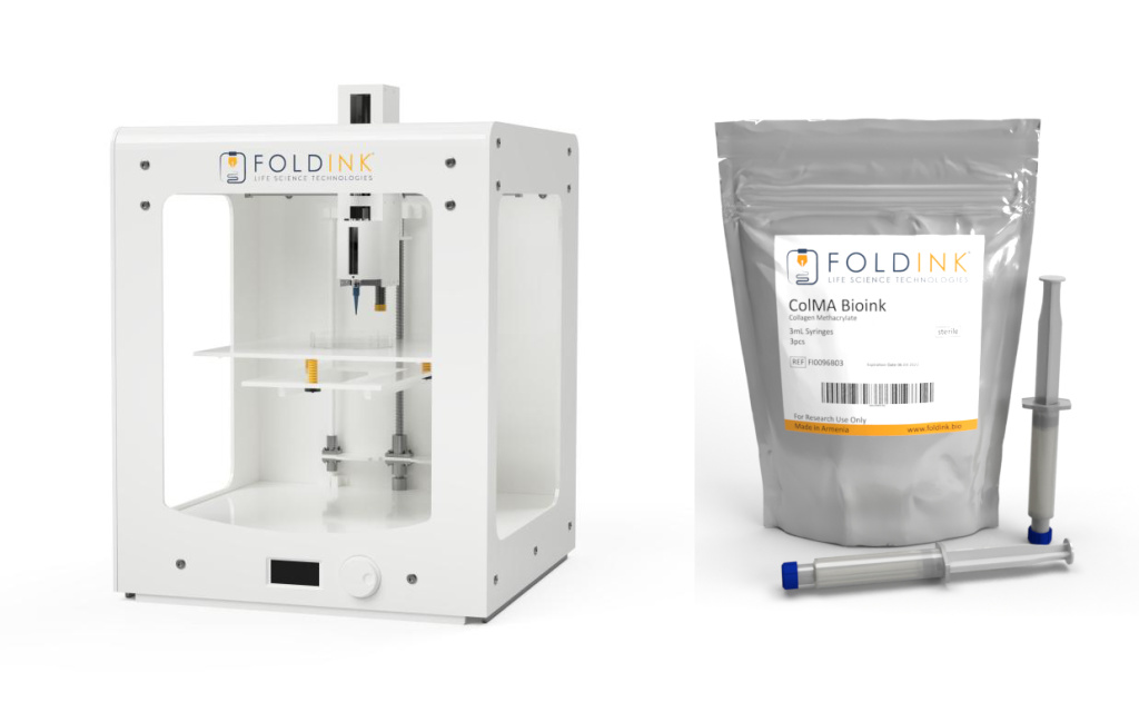 Биочернила FOLDINK ColMA (коллаген-метакрилоил) состоят из коллагена, модифицированного метакриловым ангидридом. Коллаген является основным компонентом внеклеточного матрикса (ECM), который важен для адгезии, роста и миграции клеток и широко используется в подходах к тканевой инженерии. Коммерчески доступный коллаген обычно получают из животных источников. Его можно использовать отдельно или в сочетании с другими компонентами. Из-за своих биосовместимых свойств и может быть сшит при изменении температуры или рН. Для повышения его сшивающих свойств с целью получения механически стабильных тканевых конструкций его можно модифицировать метакриловым ангидридом, что придает ему способность гелеобразовать под воздействием ультрафиолета (в случае использования Irgacure 2959 в качестве фотоинициатора) или видимого света (в случае использования в качестве фотоинициатора Irgacure 2959) случае использования LAP в качестве фотоинициатора экспозиция. Это позволяет точно выбирать и контролировать биомеханические свойства биопечатных конструкций. Соотношение коллагена и метакрилоила характеризуется термином, называемым степенью метакрилирования или степенью функционализации. Foldink предлагает биочернила ColMA с разной степенью функционализации. Стандартный пакет биочернил Foldink ColMA включает Irgacure 2959 (365 нм) в качестве фотоинициатора для УФ-сшивания или LAP (405 нм) для сшивки в видимом свете. Характеристики биочернил ColMA Bioink