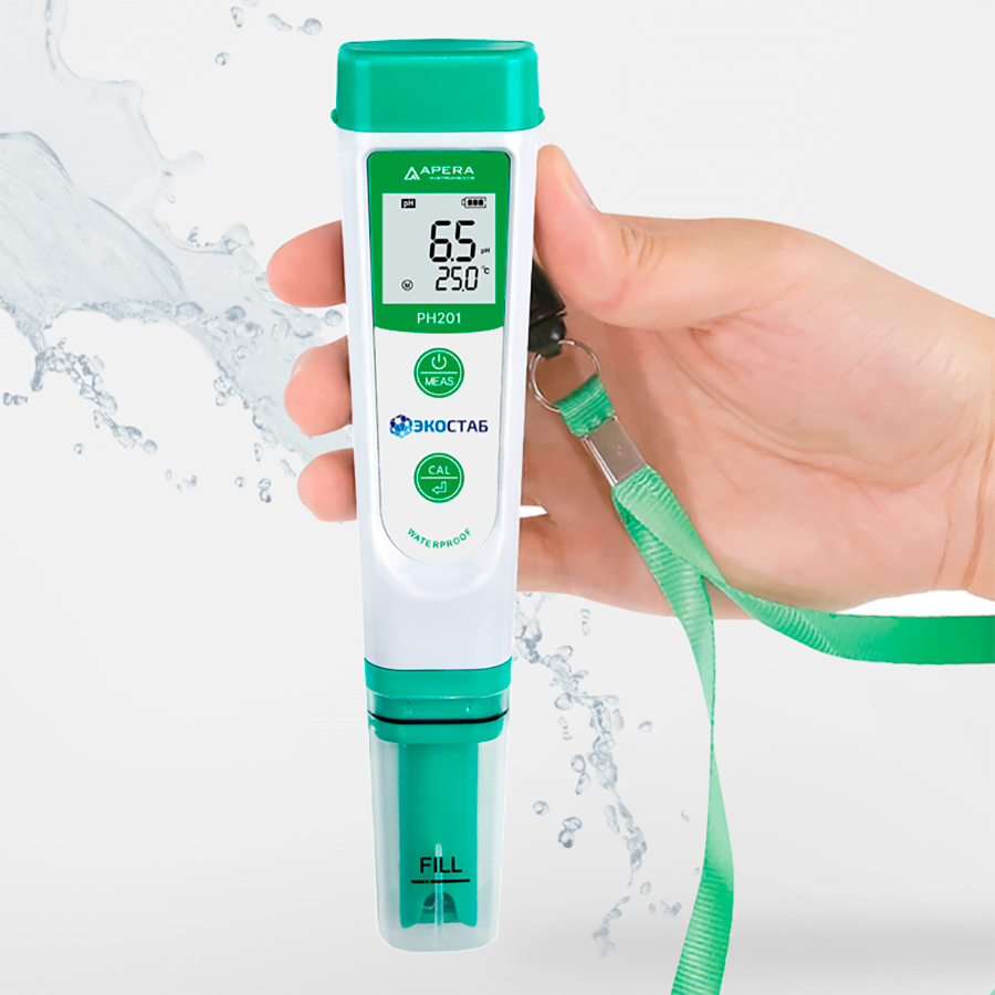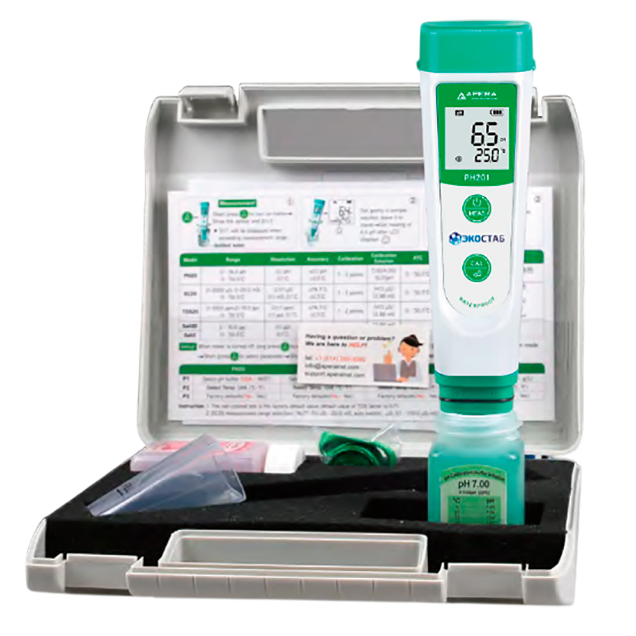 pH-метр — это прибор, используемый для измерения степени кислотности или щелочности водных растворов. Принцип работы основа на электрохимическом процессе, который позволяет анализировать pH раствора по его электрическому потенциалу. pH-метр содержит электроды, которые погружаются в жидкий образец, и устройства для определения и отображения полученных данных. По результатам анализа определяется уровень pH, который может варьировать от 0 (кислотный) до 14 (щелочной). pH-метры широко используются в лабораторной практике, а также в промышленности, сельском хозяйстве и других областях для контроля и регулирования pH в различных процессах. рН-метр карманный PH201 простое, удобное устройство для измерения рН во всем диапазоне 0 до 14, точность измерений составляет ± 0,1. Прибор оснащен ЖК-дисплеем, электрод встроенный. рН-метры серии 200 это карманные приборы, пылевлагозащита класса IP67 и ударозащищенная конструкция которых позволяют использовать прибор в полевых условиях для простых рутинных измерений. Характеристики рН-метра PH201, Apera Instruments