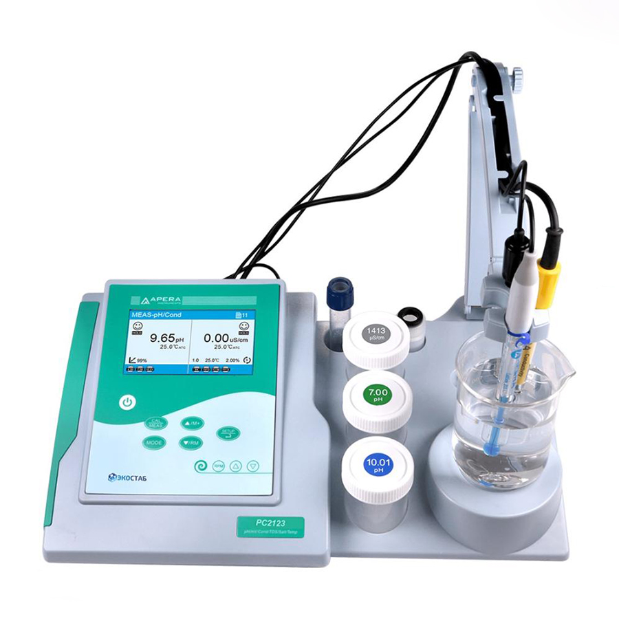 pH-метр — это прибор, используемый для измерения степени кислотности или щелочности водных растворов. Принцип работы основа на электрохимическом процессе, который позволяет анализировать pH раствора по его электрическому потенциалу. pH-метр содержит электроды, которые погружаются в жидкий образец, и устройства для определения и отображения полученных данных. По результатам анализа определяется уровень pH, который может варьировать от 0 (кислотный) до 14 (щелочной). pH-метры широко используются в лабораторной практике, а также в промышленности, сельском хозяйстве и других областях для контроля и регулирования pH в различных процессах. pH-метр PH2121 удобное устройство для измерения рН во всем диапазоне от 0 до 14, точность измерений составляет ± 0,01. Прибор оснащен TFT-дисплеем цветным, поставляется вместе с электродом LabSen211 с корпусом из стекла, температурным датчиком МР500. рН-метры серии 2120 это настольные приборы, оснащены удобным меню и USB- интерфейсом, измерительным стендом с держателем электродов и магнитной мешалкой. Характеристики pH-метра PH2121, Apera Instruments