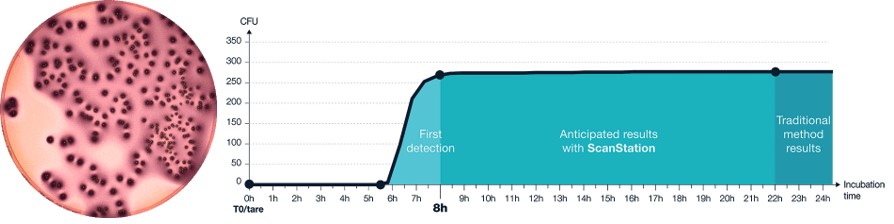 Автоматическая система ScanStation — полностью роботизирована ипозволяет проводить инкубацию, детекцию и подсчет колоний на агаризованных средах на чашках Петри различного диаметра от 55 до 90 мм в режиме реального времени. Полный цикл исследования ScanStation в режиме реального времени составляет 24 ч, предварительные результаты доступны по истечении первых 8 часов.