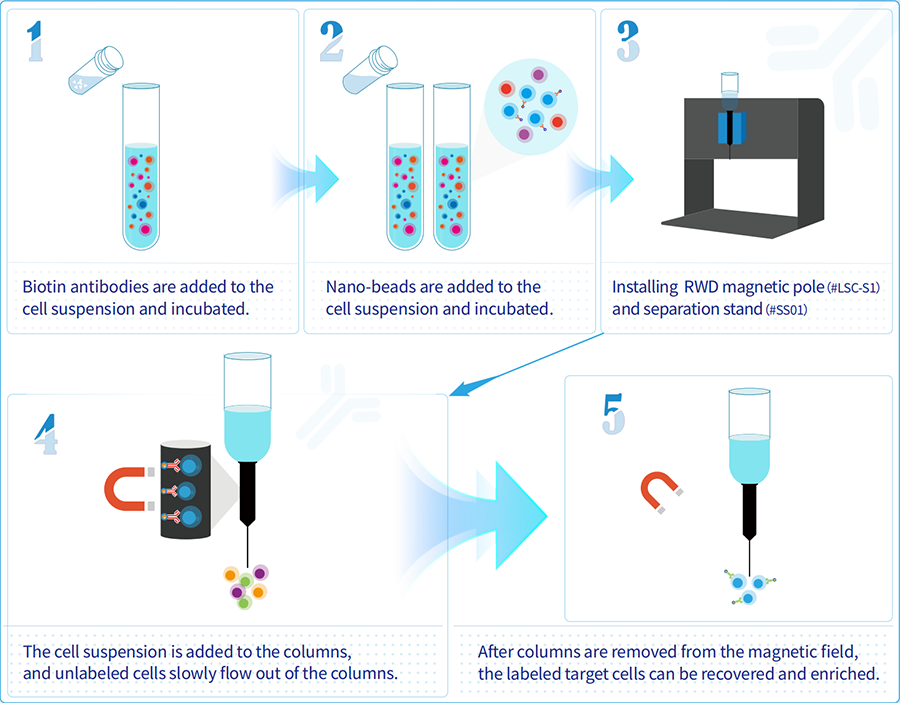 Продукты для разделения клеток RWD включают в себя наборы для разделения клеток с магнитными микрошариками и колонки для разделения клеток, которые позволяют проводить сепарацию с высокой чистотой и высокой жизнеспособностью за счет простой работы. Наноразмерные магнитные шарики не требуют элюции, а разделенные клетки можно напрямую использовать в последующих экспериментах, таких как проточная цитометрия, культивирование клеток, секвенирование отдельных клеток и т.д. Преимущества набора для магнитной сепарации RWD
