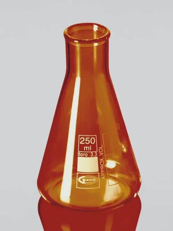 Чем она хороша? Плоское дно не позволяет ей опрокидываться, узкое горло предотвращает разбрызгивание, испарение и удобно закрывается с пробкой. Лучшие экземпляры имеют градуировку, чтобы видеть приблизительный объем, а также фрагмент загрунтованного стекла для нанесения заметок. И наконец, колба имеет конический корпус, что позволяет легко перемешивать содержимое в процессе эксперимента, либо рукой, либо зафиксировав в специальном устройстве для автоматизации перемешивания, шейкере.
