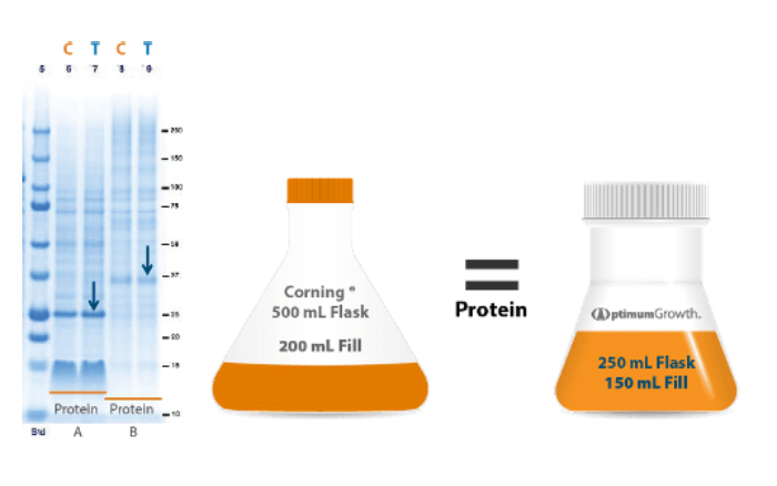 Данные колбы позволяют заполнять 50-60% объема по сравнению со стандартными колбами Эрленмейера 15-20%. По эффективности они эквивалентны стандартным колбам большего объема с точки зрения количества наработанного белка, но при 50-60% объема заполнения, колбы Optimum Growth обеспечивают гораздо больший общий выход на колбу (Рис. 5), что экономит пространство внутри шейкера- инкубатора, экономит питательную среду, а использование специальных крышек для переноса позволяет исключить перекрестную контаминацию при культивировании и различных манипуляциях.