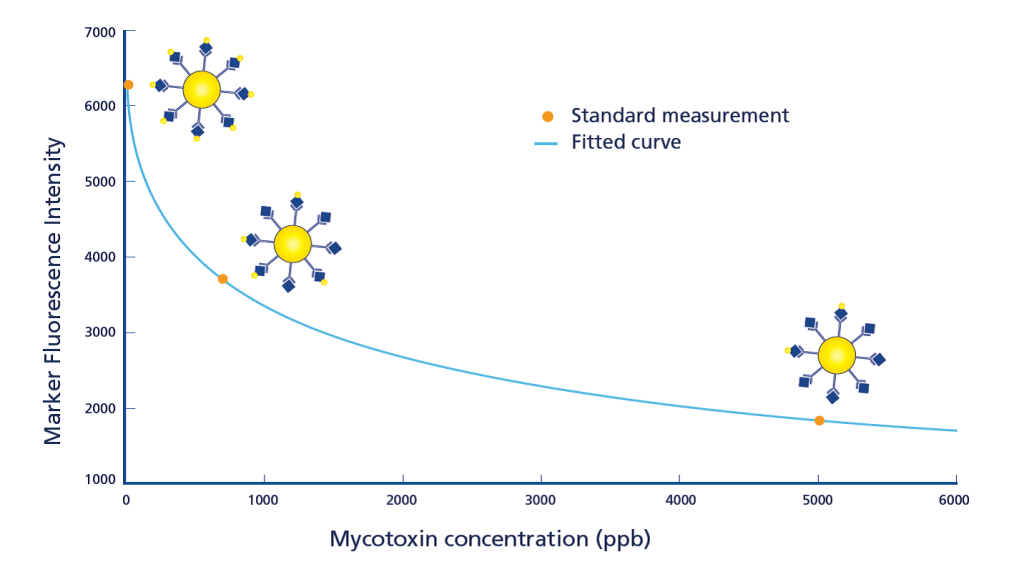Рис. 5. Калибровочная кривая: чем сильнее флуоресцентный сигнал, тем ниже содержание микотоксинов в образце.