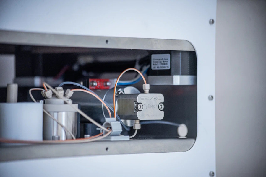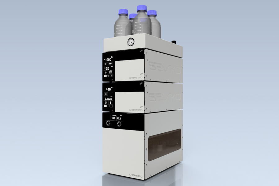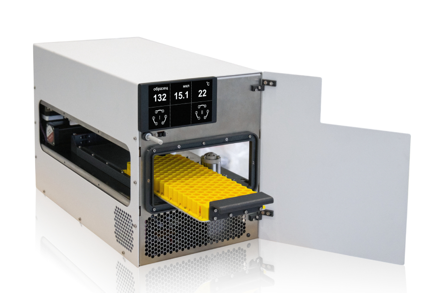 Эта система обеспечивает высокую точность и надежность результатов, что делает её незаменимым инструментом для специалистов в этих областях. ВЭЖХ "Скороход" — первая в России компактная модульная система, которая включает в себя: Насосы серии НЖХ-1000. Эти насосы способны работать при максимальном давлении 650 бар в исполнении из нержавеющей стали SS 316 и 350 бар в инертном варианте. Они оснащены двойными входными обратными клапанами, что предотвращает «залипание» клапанов при использовании 100% органических растворителей. Насосы НЖХ-1000 могут работать с двумя типами градиентов в зависимости от конфигурации: четырех градиентный со смешиванием на низком давлении и бинарный градиент со смешиванием на высоком давлении. Дегазацию обеспечивает вакуумный дегазатор мембранного типа с пятью камерами (серия ДМВ-1000), который устойчив ко всем органическим растворителям. Компактность системы дополнительно достигается за счет интегрированного термостата для колонок, который поддерживает температурный режим от -10 °C до +100 °C и вмещает до четырех колонок длиной 300 мм. Автоматический дозатор образцов серии АДХ-1000 представляет собой автодозатор прямого дозирования, который осуществляет ввод пробы через иглу с помощью дозирующего клапана и встроенного инжекционного порта. Это решение минимизирует перенос пробы и перекрестное загрязнение. Модуль АДХ-1000 также оснащен функцией термостатирования образцов в диапазоне температур от 5 °C до +60 °C. Стандартный объем петли для ввода проб составляет 100 мкл. Интерфейс — Ethernet 10/100. Поддон для бутылей — вместимость до 6 бутылей. Комплектация ВЭЖХ "Скороход": каждый модуль оборудован большим сенсорным экраном. Доступны следующие детекторы: спектрофотометрический, диодно-матричный, рефрактометрический, флуориметрический, светорассеивания, совместим с гамма-спектрометрический детектором "МУЛЬТИРАД-гамма" для ВЭЖХ с блоком детектирования БДКС-25-02-2А и свинцовой защитой СЗГ-17 для определения радиохимической чистоты и радиохимических примесей. В разработке кондуктометрический детектор. Программное обеспечение Мультихром