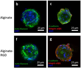 Капли, содержащие во внутренней фазе микрогель альгинат или альгинат-RGD, которые помещали в среду, содержащую ионы Ca2+, что приводило к образованию кросс-сшивок между цепями альгината и формировало трехмерную пространственную пористую структуру с образованием твердого геля. Клетки hMSC сфероидов в обоих случаях показывали экспрессию E-кадгерина, а в случае альгинат-RGD также экспрессировался интегрин α5β1, что может привести к заключению, что аминокислотная последовательность RGD (аргинин-глицин-аспартат) приводила к экспрессии рецепторов на поверхности клетки, которые могли бы в дальнейшем направить дифференцировку клетки по остеогенному пути, что наблюдалось в одном из экспериментов. Через 7 дней после культивирования сфероидов, инкапсулированных в альгинат-RGD гель, наблюдалось повышенное содержание кальциевых депо (окраска ализариновым красным) и повышенная активность щелочной фосфатазы, что свидетельствует о начале дифференцировке в костную ткань.