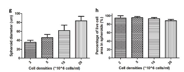 Размер образующихся сфероидов контролировали, варьируя плотность: 2, 5, 10, и 20 миллионов клеток на мл клеточной суспензии, используемой для инкапсуляции клеток в канале 200 мкм давали в среднем примерно 8, 20, 40 и 80 клеток на одну каплю, что приводило к получению сфероидов диаметром 36, 46, 62 и 84 мкм, соответственно.