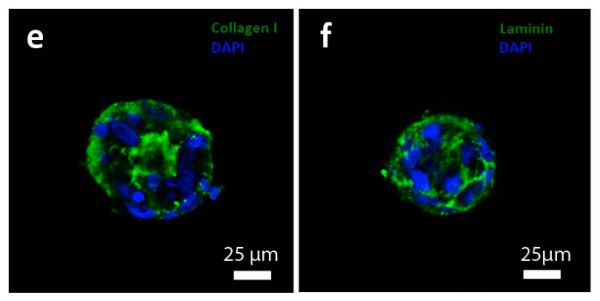 Также было показано, что клетки, образовавшие сфероиды формируют сложную пространственную сеть внеклеточного белкового матрикса, включающего коллаген I типа и ламинин, которая напоминает внеклеточный матрикс, наблюдаемый в тканях in vivo.