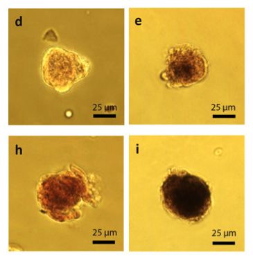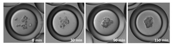 В то же время, внутри капель двойной эмульсии клетки агрегировали и образовывали сфероиды в течение 150 минут за счет эффекта ограничения объема (microscale confinement), который способствовал межклеточным взаимодействиям. Частота формирования сфероидов из отдельных клеток в каплях составила почти 100%.